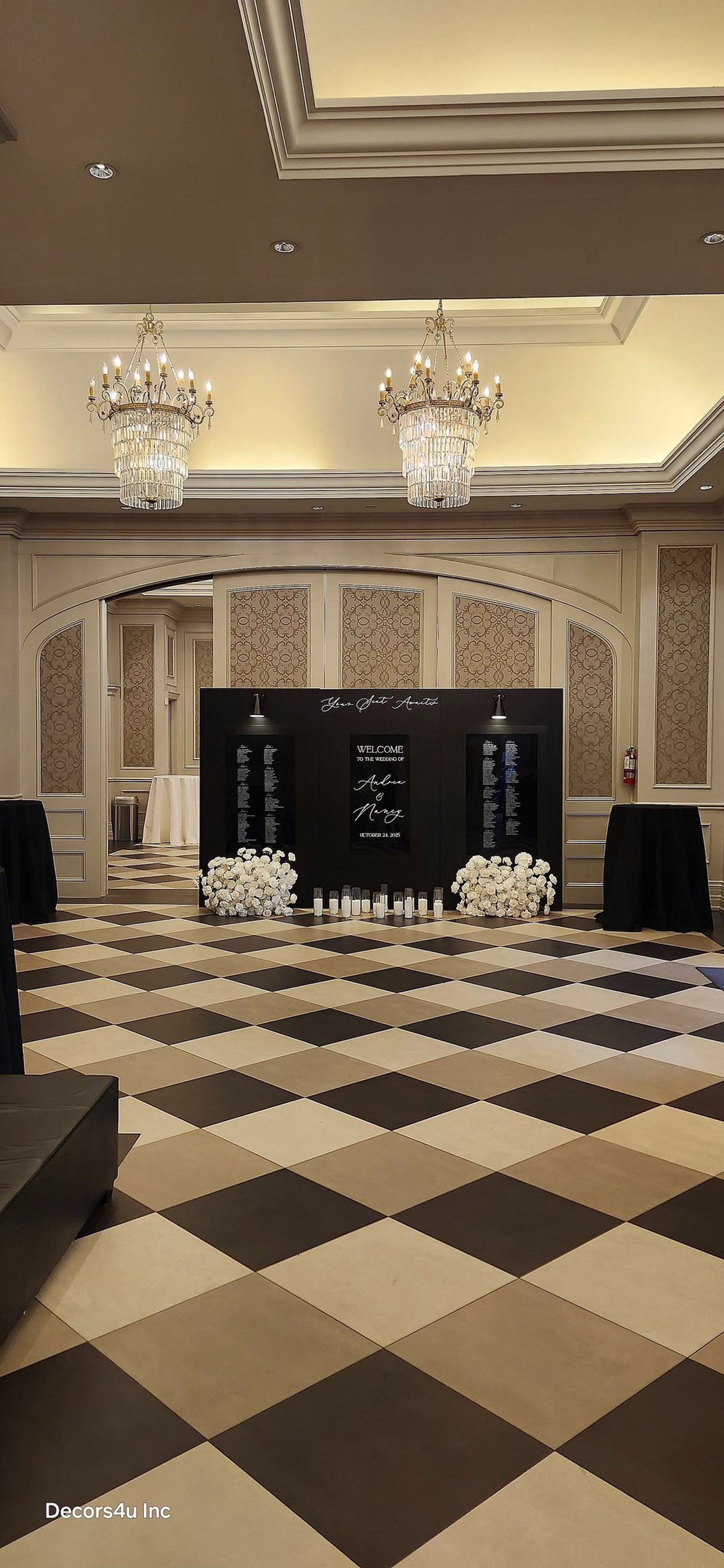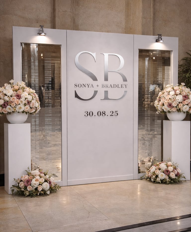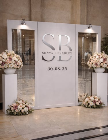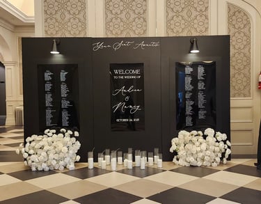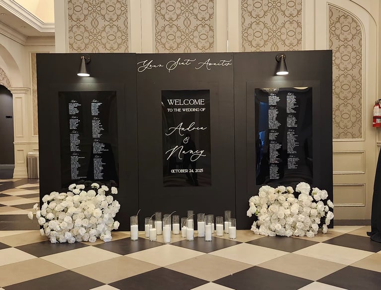 Premium backdrops, Custom seating charts, champagne walls & statement décor for weddings and events.