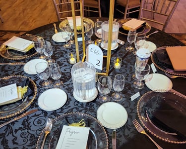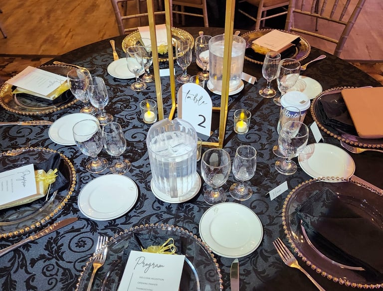 Luxury tabletop rentals including charger plates, gold-rim glassware, candle holders, and elegant accents that bring cohesion and polish to every tablescape.