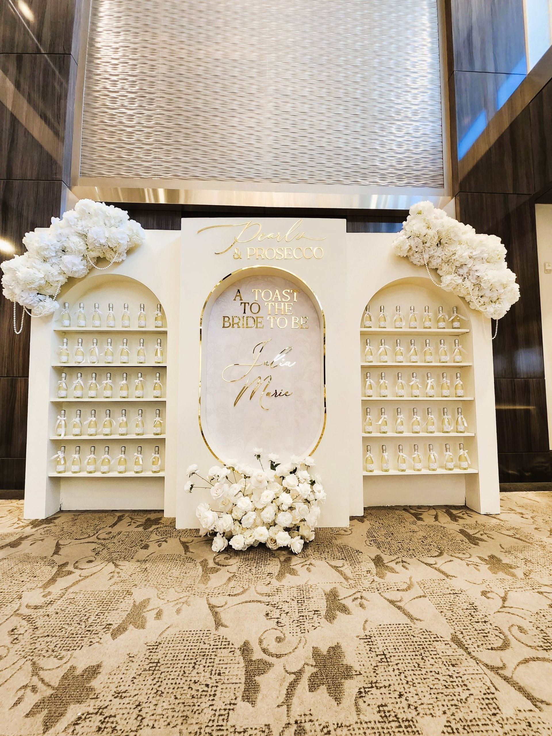 Premium backdrops, Custom seating charts, champagne walls & statement décor for weddings and events.