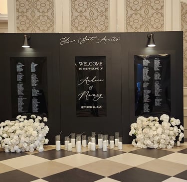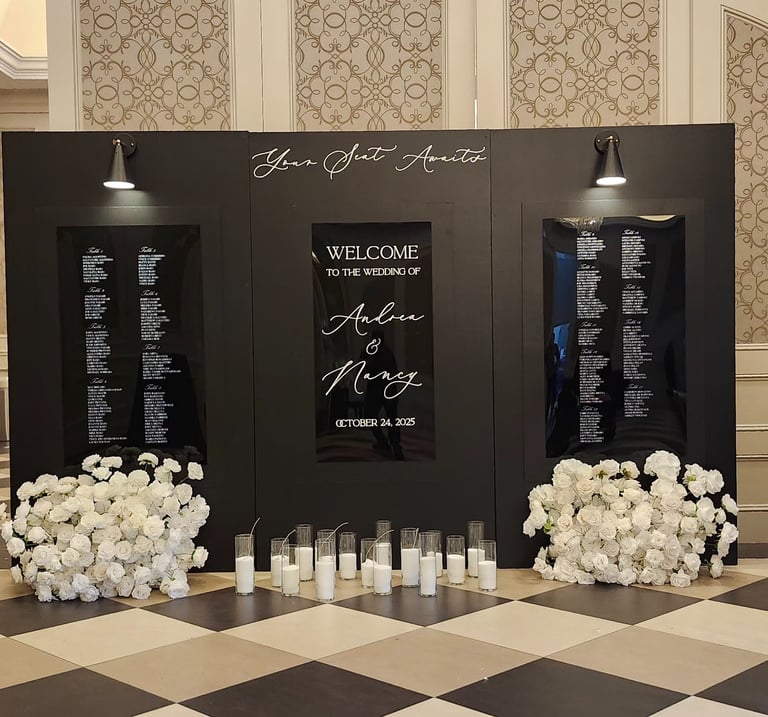 This custom made seating chart by us at Decors4u was hand crafted for perfect for this beautiful wedding at the Royal Ashburn Golf Club in Whitby. We received a tremendus amount of compliments from guests who were not only impressed by the design but also by how it seamlessly blended with the overall theme of the event. Every detail was meticulously thought out to ensure that each guest felt a personal connection to their designated spot. If you are looking to create a memorable seating chart that leaves a lasting impression on your guests, look no further... Our team dedicates itself to transforming your vision into a stunning visual representation that captures the essence of your special occasion.